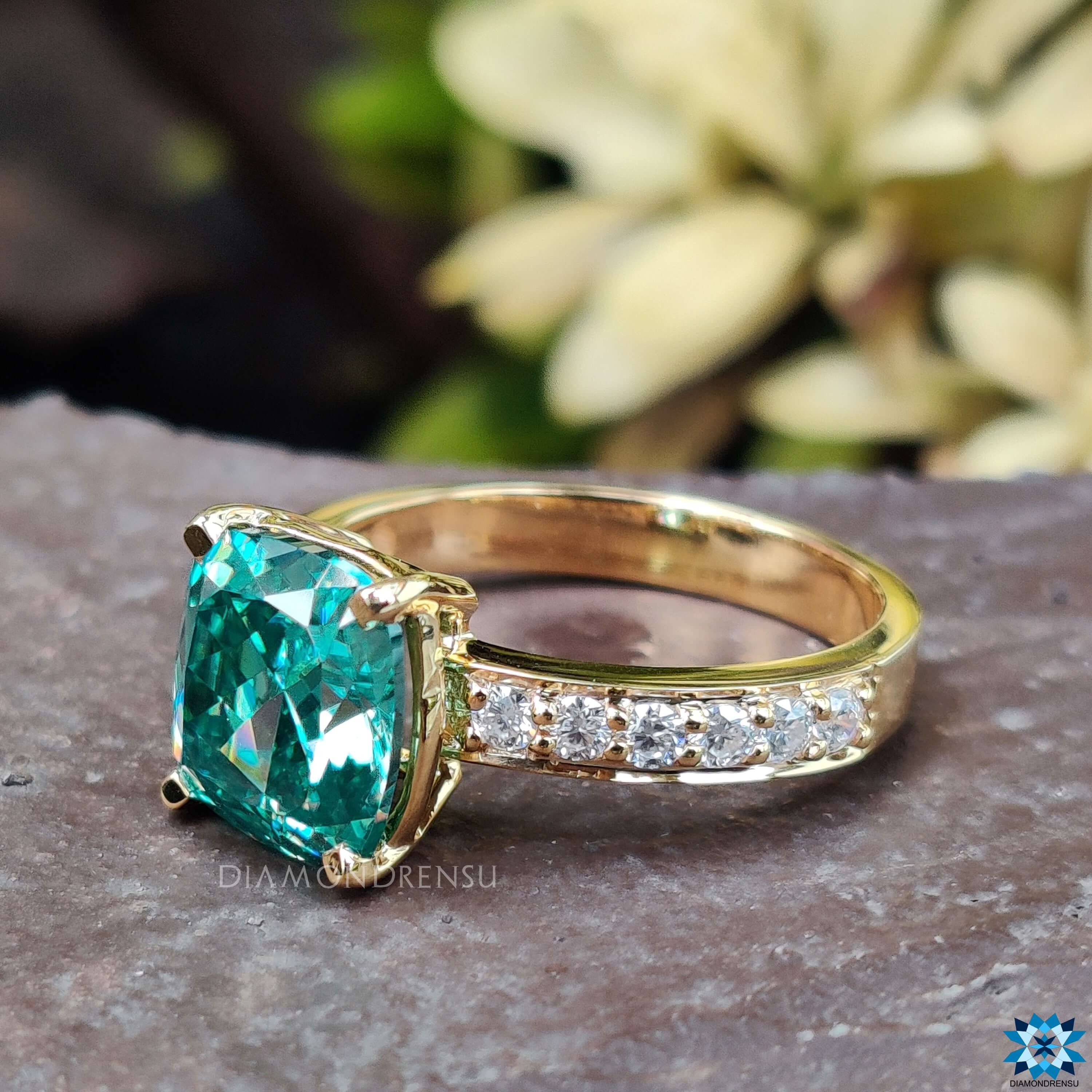 This affordable moissanite engagement ring features a cyan blue cushion divine moissanite beautifully held in four prongs. Additionally, pave set of tiny round cut stones placed on the shank gives extra sparkle. Moreover, this ring also comes with a basket setting. The basket setting is the best setting in which the center stone is perfectly held. The listed design will also be made with any center stone of your choice with any metal tone.