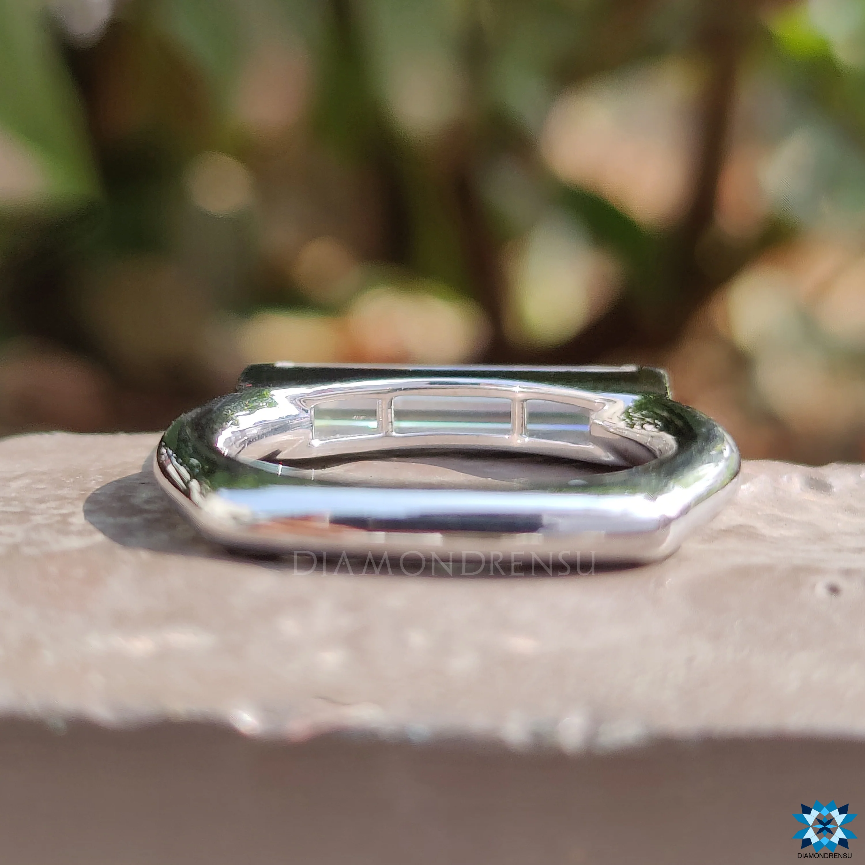 This affordable moissanite wedding ring features the center beauty of elegant colorless baguette cut moissanite which is safely captured by bar setting. The bar setting simply means that your stone is held in place by precious metal bars. A simple and minimalist ring is the perfect wedding gift for her.